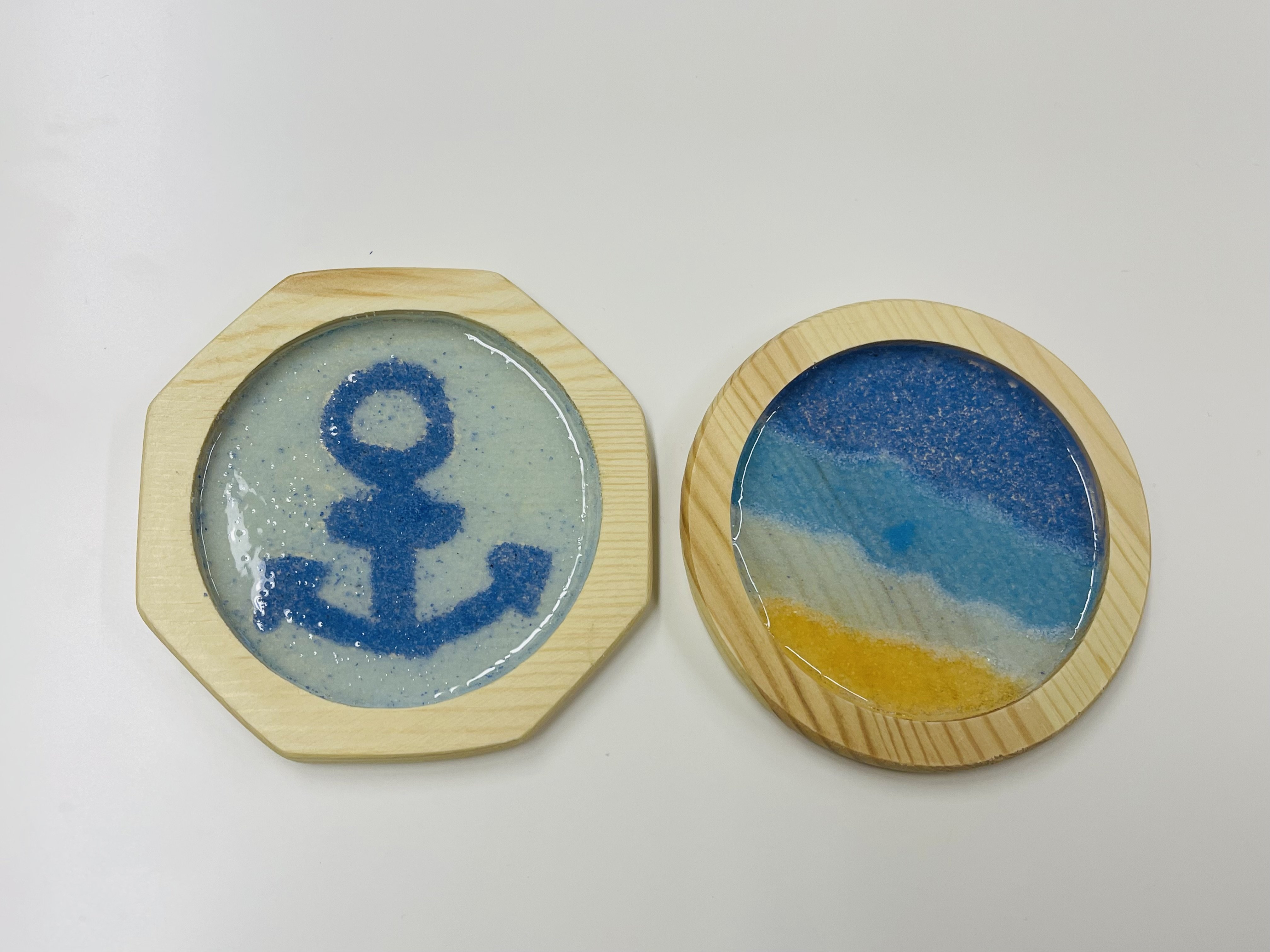 色のついた砂(カラーサンド)を使って砂絵を描き、オリジナルのコースターを作ろう!